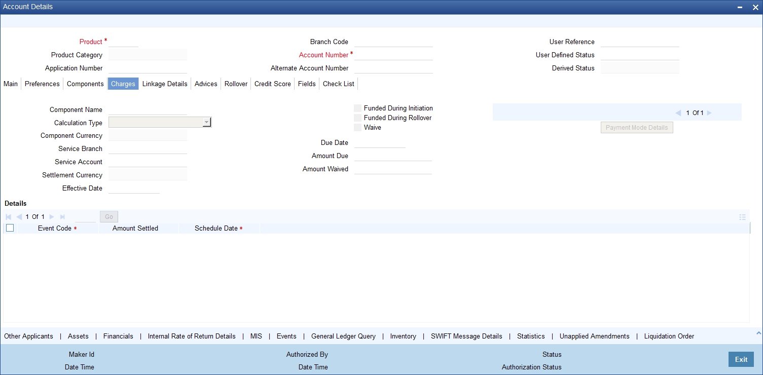 Payment can be against any or all or a combination of the components due. Prepayments will attract a pre-payment penalty to be charged. The payment computed by the system can be overridden by the amount negotiated by the customer and a subsidy is captured as amount waived. The amount accepted is either waived or capitalized. Depending on the mode selected, additional payment details such as clearing house details, settlement products to be used if the settlement is through another product of Oracle FLEXCUBE, etc are captured.