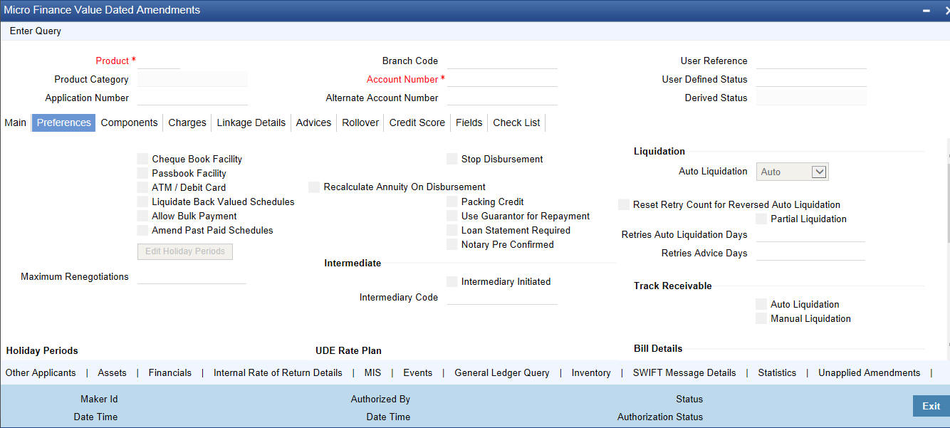 For more details on the field explanation refer section ‘Creating a Microfinance Account’ in ‘Account Creation’ chapter of this User Manual. Also refer ‘Microfinances Amendments’ section in this chapter.