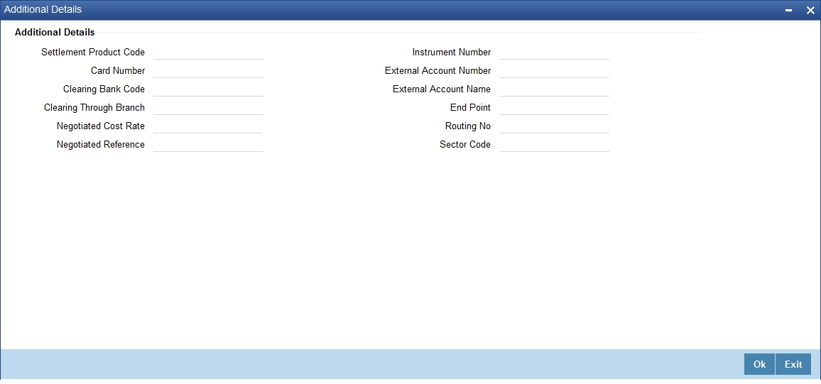 Specify the code of the external bank that should be used for clearing maintenance. The adjoining option list maintains all valid banks maintained in the system. You can choose the appropriate one.