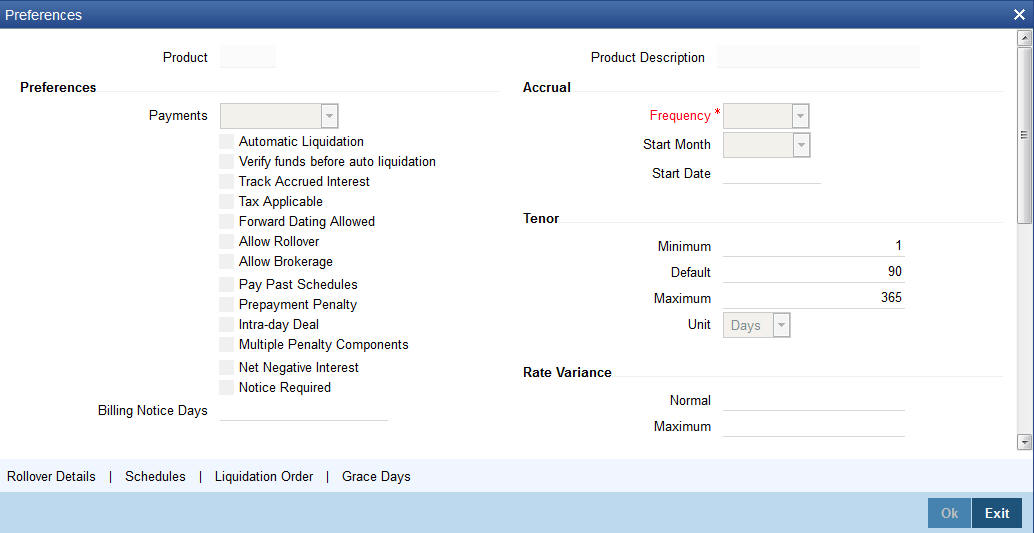 The product definition facility is a one-time effort. When defining a money market deal type or scheme as a product, you can specify (amongst other details):