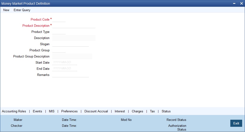 While defining a new product, you should enter a code, which is unique across the different modules of Oracle FLEXCUBE. For instance, if you have used MM01 for the Money Market module, you cannot use it as a code in any other module.