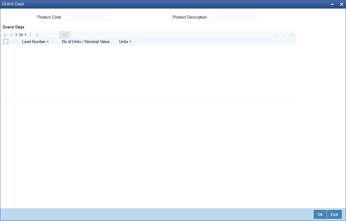 Click ‘Grace Days’ in the Product Preferences screen to access the Grace Days Definition screen. The level numbers get defaulted depending on the number of levels defined in the ICCF Details screen, irrespective of the Basis Amount Type i.e. if you define three levels of penalty for the Basis Amount type Principal and four levels of penalty for the Basis Amount type Interest, levels 1 to 4 will be available to you in the Grace days definition screen. You will not be able to add levels in this screen. Since the level numbers get defaulted from the ICCF Details screen, it is imperative that the expected and overdue components are defined at the ICCF Details screen, prior to the definition of grace days for the levels.