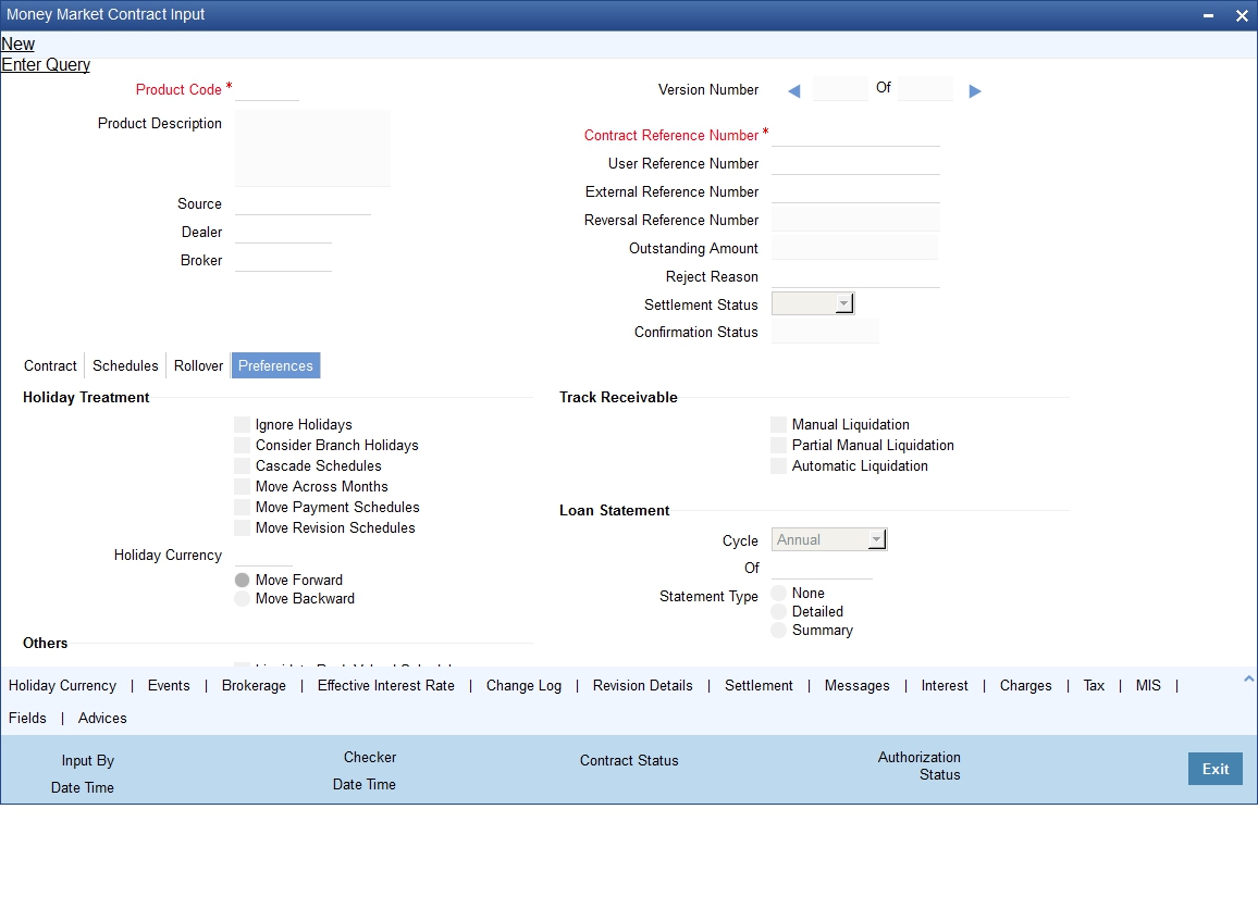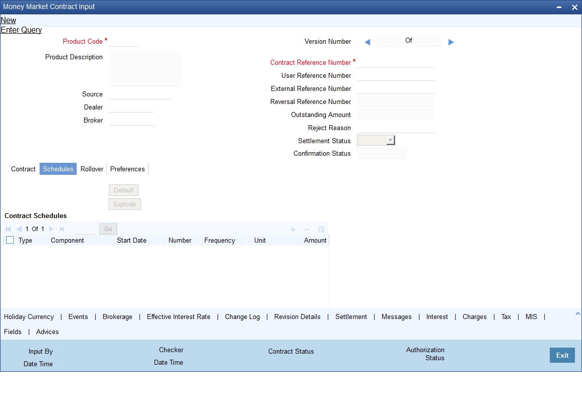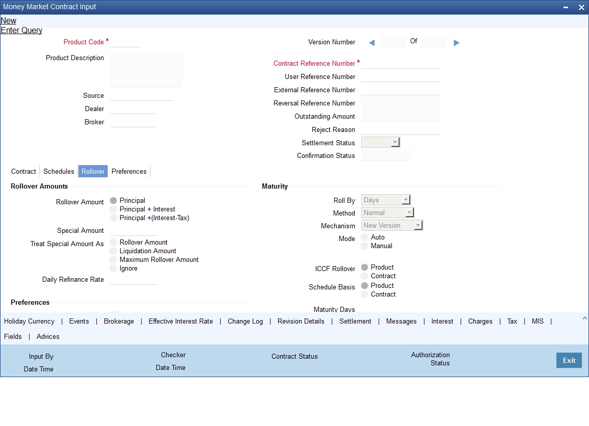 A deal that you enter into acquires the details specified for the product. However, you also need to enter information that is specific to the contract. You can enter details specific to a contract in the Contract Details screen. You can invoke the ‘Money Market Contract Input’ screen by typing ‘MMDTRONL’ in the field at the top right corner of the Application tool bar and clicking the adjoining arrow button