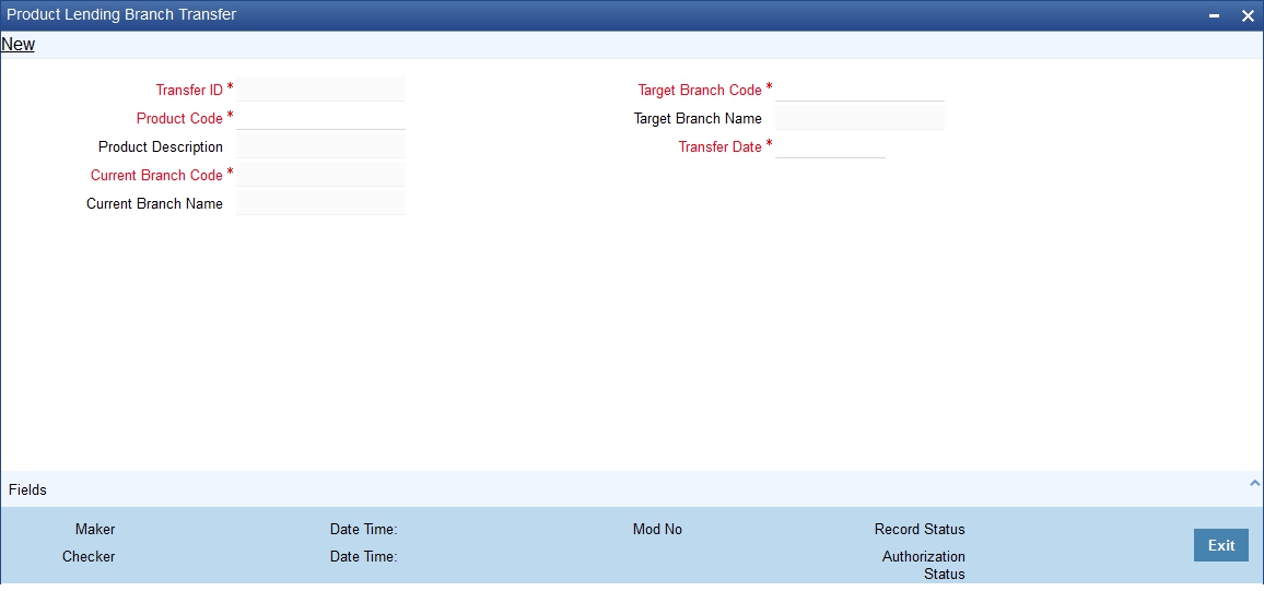 You can transfer mortgage belonging to a product in Product Mortgage Branch transfer screen. You can transfer mortgages or commitments for all the records with transfer date greater the current date from the source branch to a target branch. You can invoke this screen by typing ‘MODPRDTR’ in the field at the top right corner of the Application tool bar and clicking on the adjoining arrow button.