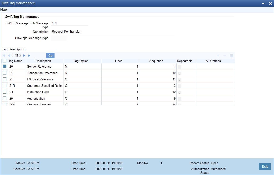 Swift message tag descriptions are factory shipped. However, it can also be maintained using this screen.