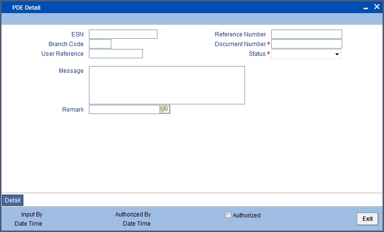 In order to view the details of the record click ‘Detail’ button. The details of the record are displayed in the ‘PDE Detail’ screen.