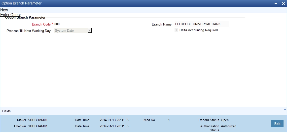 In this screen, you must identify the code of the branch for which you are specifying Branch Parameters. Additionally, you are required to indicate the manner in which events (liquidation, charges etc) falling due on a holiday are to be processed.