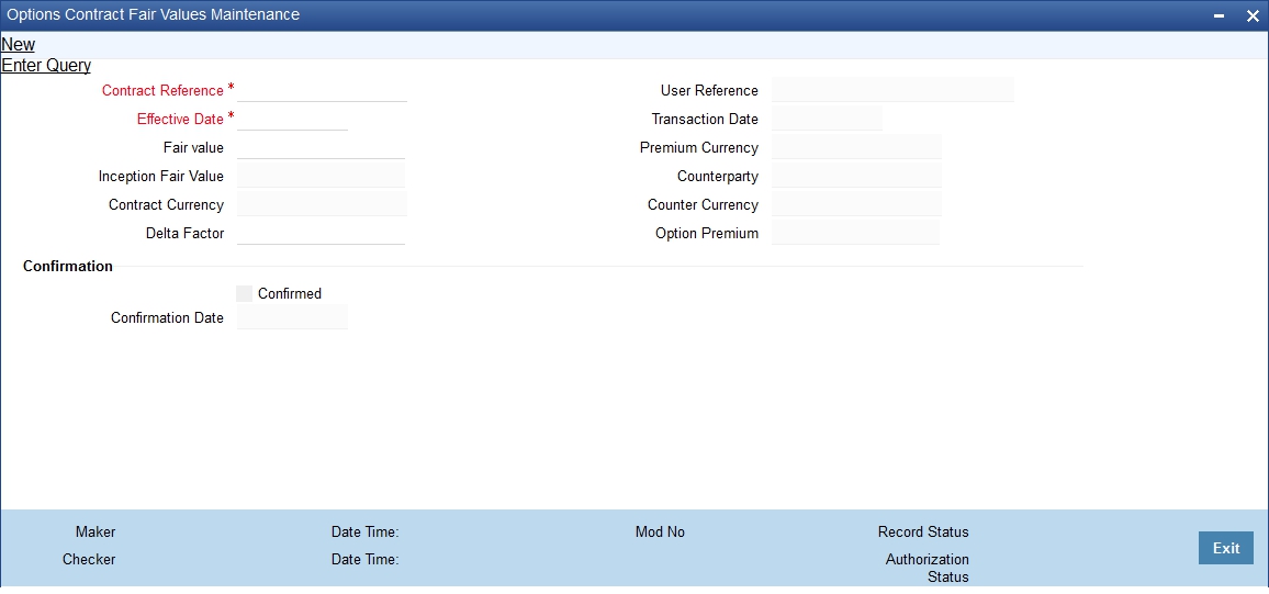 Option Fair Values can be updated through the ‘Contract Fair Value Maintenance’ screen. You can invoke the ‘Option Contract Fair Values’ screen by typing ‘OTDXCNVL’ in the field at the top right corner of the Application tool bar and clicking the adjoining arrow button.