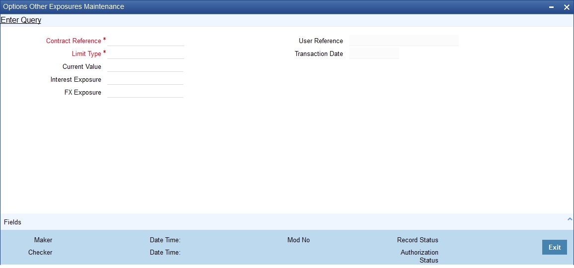On Inception of the contract, you can specify the Line, the Master Agreement Code, the marked-to-market value of the option, exposure to be tracked due to interest rate fluctuation and exchange rate movements. After the booking of the contract you can specify the various exposures through the ‘Options Other Exposure Maintenance’ screen.