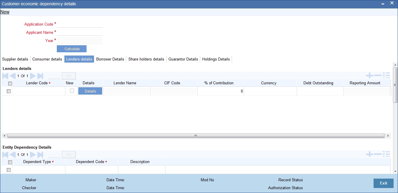 Select the lender code as maintained in the ‘Entity Details Maintenance’ (ORDENTYM) screen. You can alternatively specify a new lender code which is not already maintained in the ‘Entity Details Maintenance’ screen.