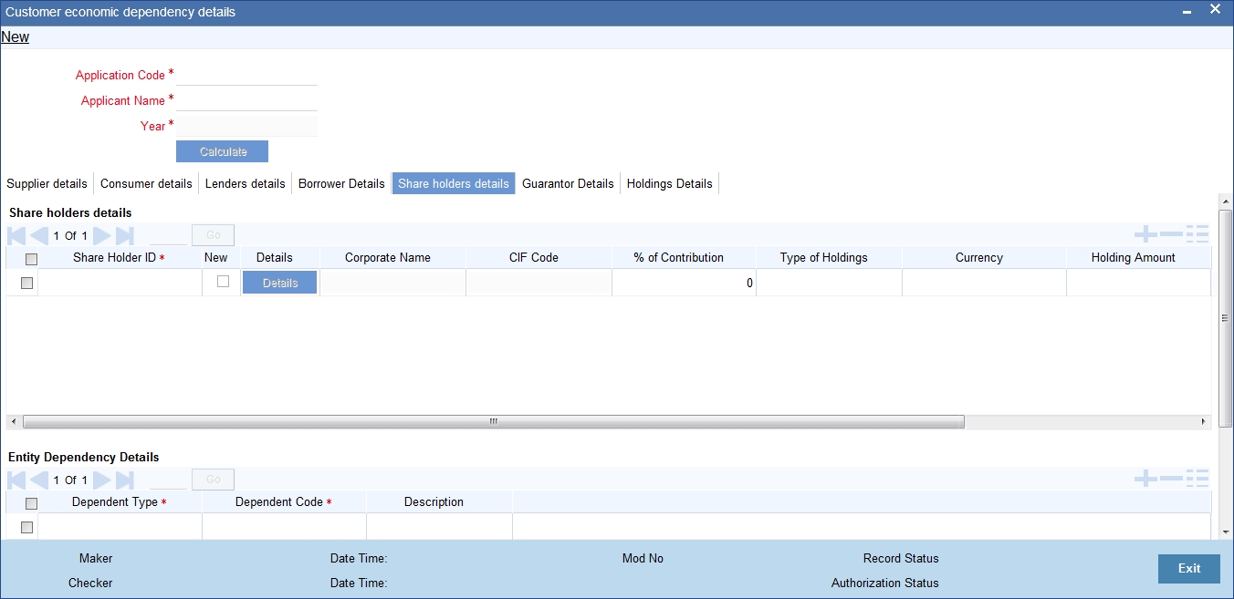 If ‘New’ check box is selected, then on clicking the’ Details’ button the ‘Entity Details Maintenance’ (ORDENTYM) screen is displayed, where further details of the new share holder is to be maintained. For more information on maintaining these details, refer to the section Maintaining Entity Details in this User Manual.