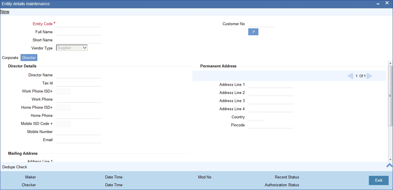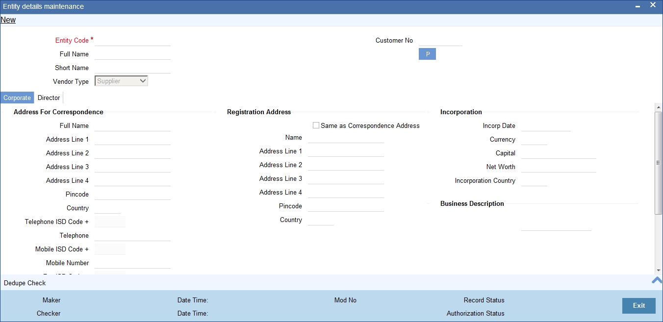 If ‘New’ check box is selected, then on clicking the’ Details’ button the ‘Entity Details Maintenance’ (ORDENTYM) screen is displayed, where further details of the new Institution is to be maintained. For more information on maintaining these details, refer to the section Maintaining Entity Details in this User Manual.