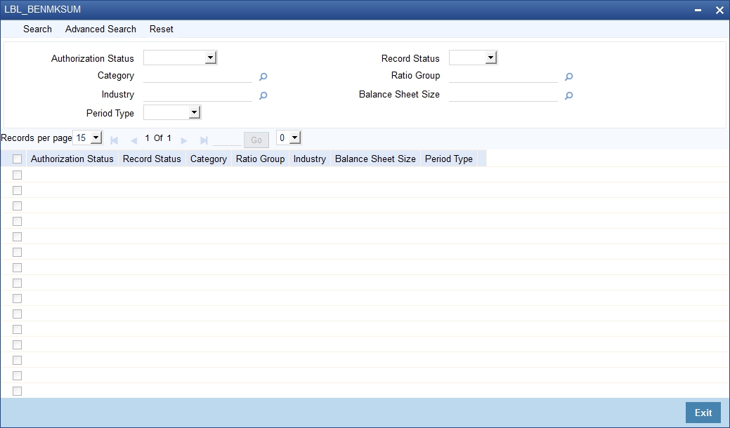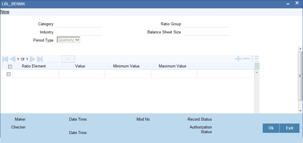 You can maintain the benchmark details for criteria like category, industry, and balance sheet size through ‘Ratio Benchmark Maintenance’ screen. The maintained benchmark values will be used to generate report for the customer financial status against the bank benchmark details.