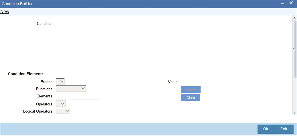 Specify the derivation formula here. You can also maintain the derivation formula in the ‘Condition Builder’ screen which is invoked by clicking the ‘Formula’ button.