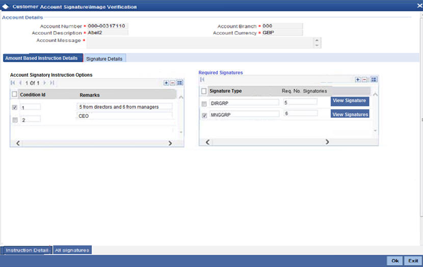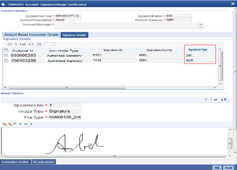 To view the customer account signature you need to select the customer account and press F12. System displays the signature details of the selected customer account and the amount based instruction details if it is a valid customer.