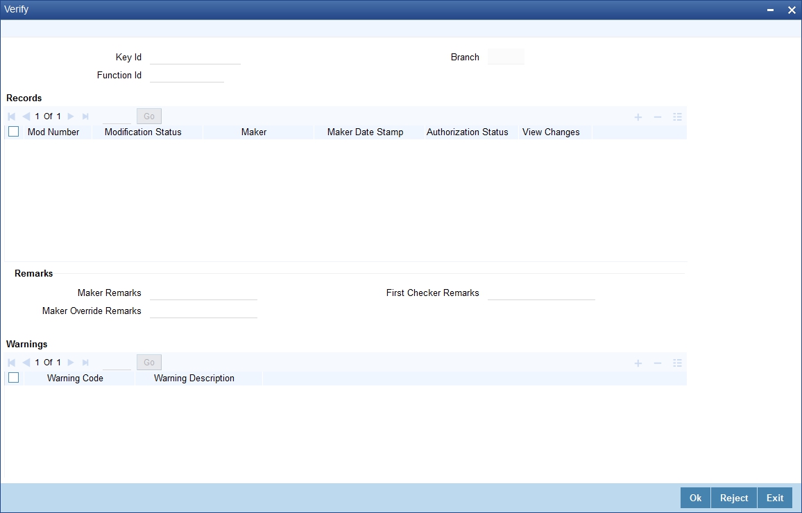 If you click ‘Reject’ button the selected modification numbers are marked as ‘Rejected’. If the authorizer selects a particular modification number and click ‘Reject’, all the modification numbers beyond the selected modification number will be marked as ‘Rejected’ and the authorizer can enter remarks in the ‘Checker Remarks’ column. Once all the tanked modifications are rejected the record is marked as ‘Rejected’.