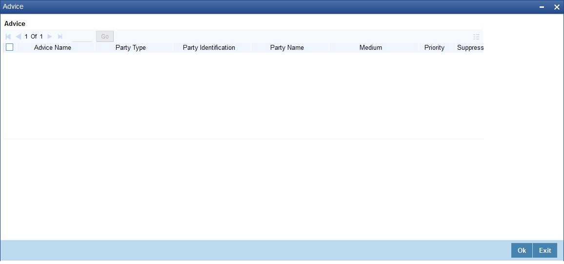 If the other party is customer of the bank, the list maintains the customer account number to select. If other party is a non-customer, the list contains the Nostro and Vostro accounts intermediary GL accounts maintained at the branch parameter.