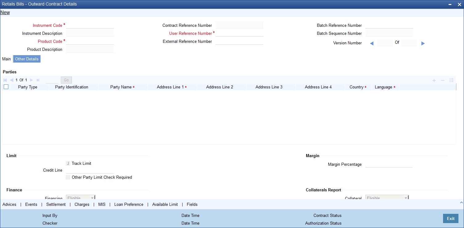 You can capture details for an Outward Retail Bills/Cheques for Collection in the 'Outward Retail Instrument for Collection' screen. You can access this screen from the Application Browser. You can also invoke this screen by typing ‘RBDOCONL’ in the field at the top right corner of the Application tool bar and clicking on the adjoining arrow button.