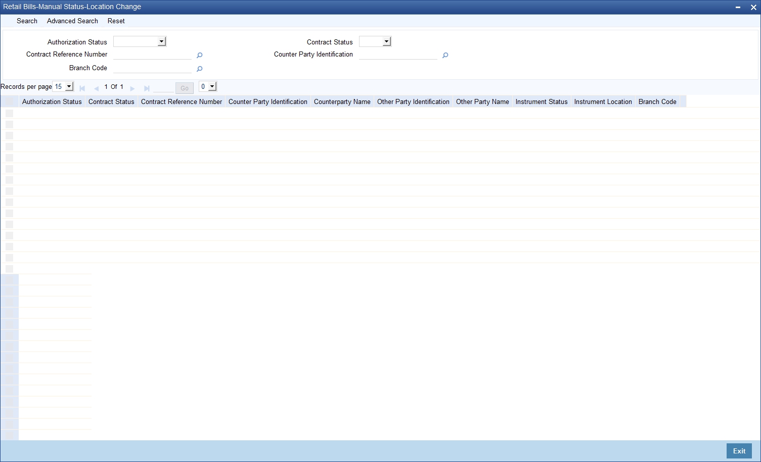The ‘Retail Bills-Manual Status-Location Change’ screen is used to change the status of the instrument and/or location of the instrument manually.
