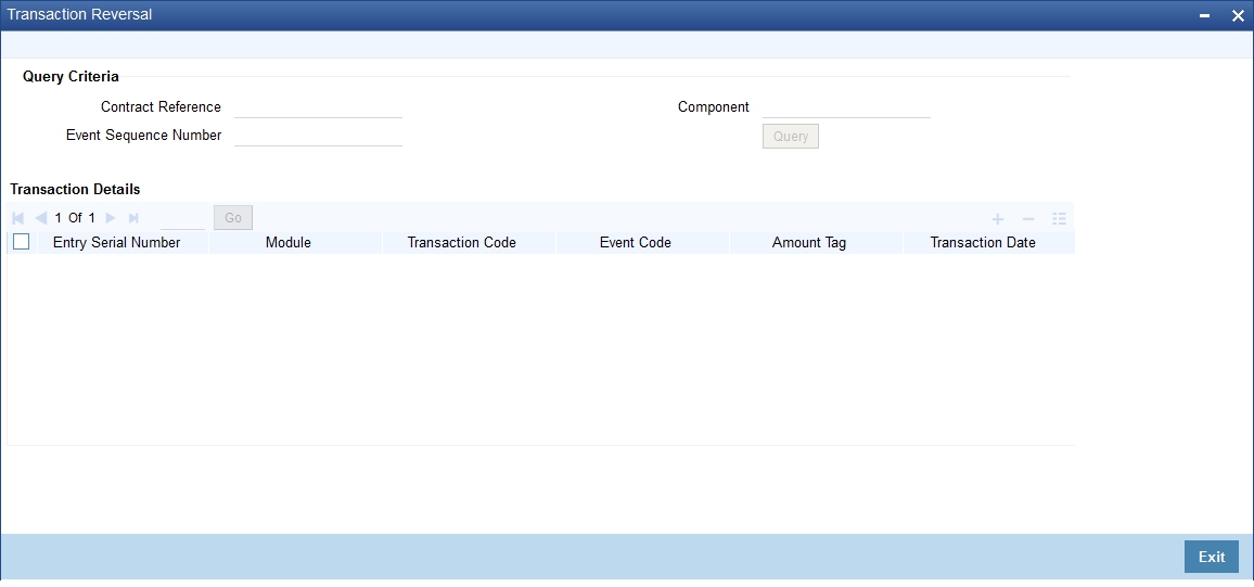 In the Teller Entry form navigate to the transaction that you want to reverse. Click reverse icon in the Toolbar or choose Reverse from the Actions menu. The system will seek a confirmation of the reversal. On confirmation, the system will reverse the accounting entries that were passed for the transaction.