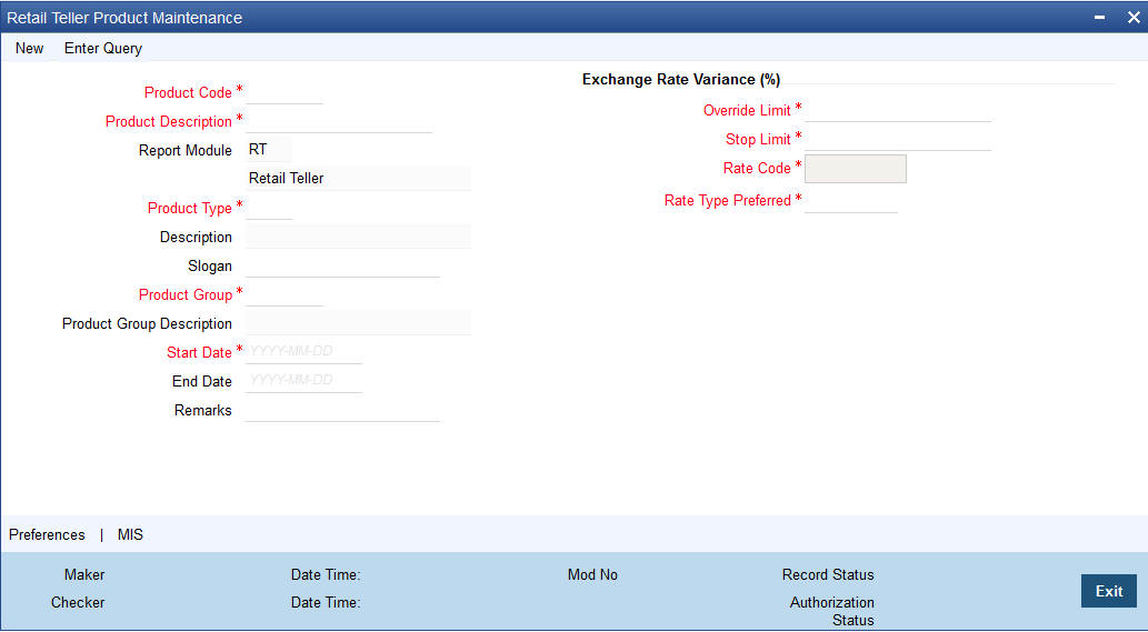 You can define the attributes specific to a retail teller product in the RT Product Definition Main screen and the Retail Teller Product Preferences screen. In these screens, you can specify the product type and set the product preferences respectively.