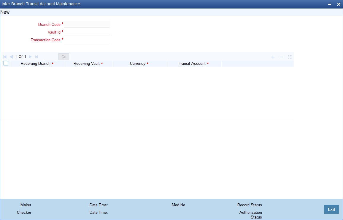 You can maintain intrabank transit account for each branch for receiver branch, vault and currency combination in the ‘Transit Account Maintenance’ screen.