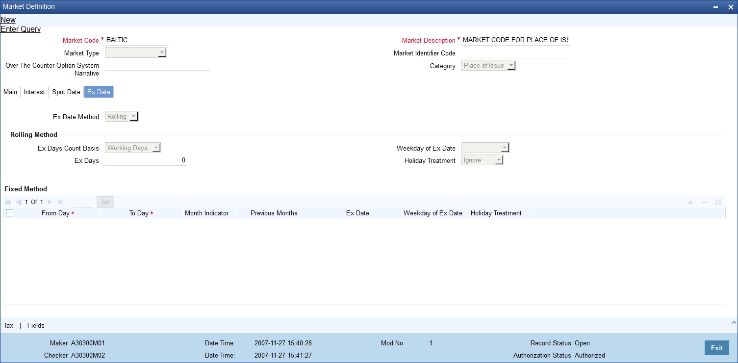 If the ex date specified is fixed then you need to maintain certain mandatory details such as the From and To dates, the month indicator and the holiday treatment. The information that you maintain here, is similar to the information entered for the spot date. This is so only if the spot date method specified, is fixed. However in such a case, the ex date will be prior to the event date.