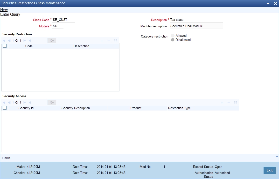 You can maintain security restrictions in the Security Restrictions Class Maintenance screen, This is invoked from the Application Browser. If you are maintaining details of a new security restrictions class, or click new icon from the toolbar. The Security Restrictions Class Maintenance screen is displayed without any details.