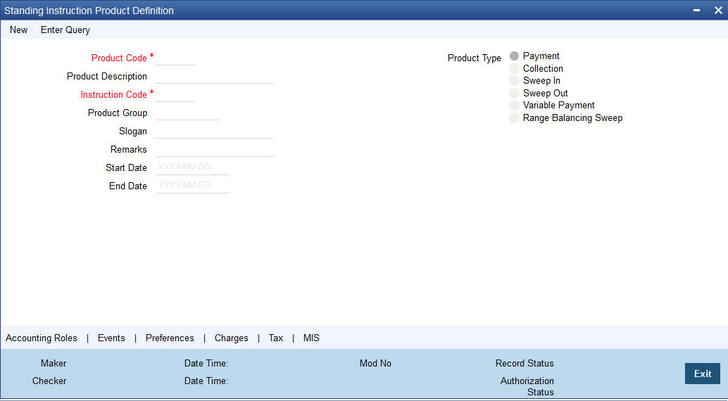 A product represents a specific service offered by your bank. For example, a certain type of account sweep, a specific type of periodic collection, etc. can be roughly termed a product. Once a product has been defined with specific attributes, individual instructions can be processed under it. This enables quick and uniform processing of instructions in all the branches of your bank.