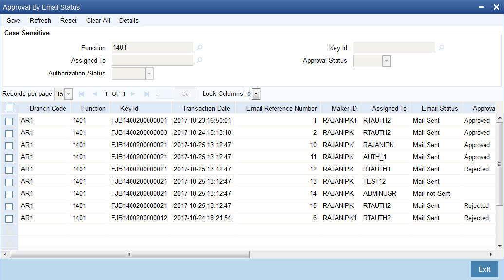 You can track the status of email requests send, approved and rejected through Approval by Email Status screen. You can invoke this screen by typing ‘CSSAMQUE’ in the field at the top right corner of the Application tool bar and clicking the adjoining arrow button.