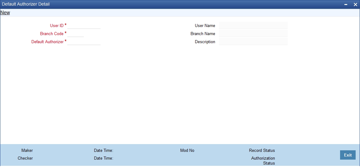 You can maintain the default authorizer by using ‘Default Authorizer Detail’ screen. To invoke this screen, type ‘STDDEFAU’ in the field at the top right corner of the Application tool bar and clicking the adjoining arrow button.