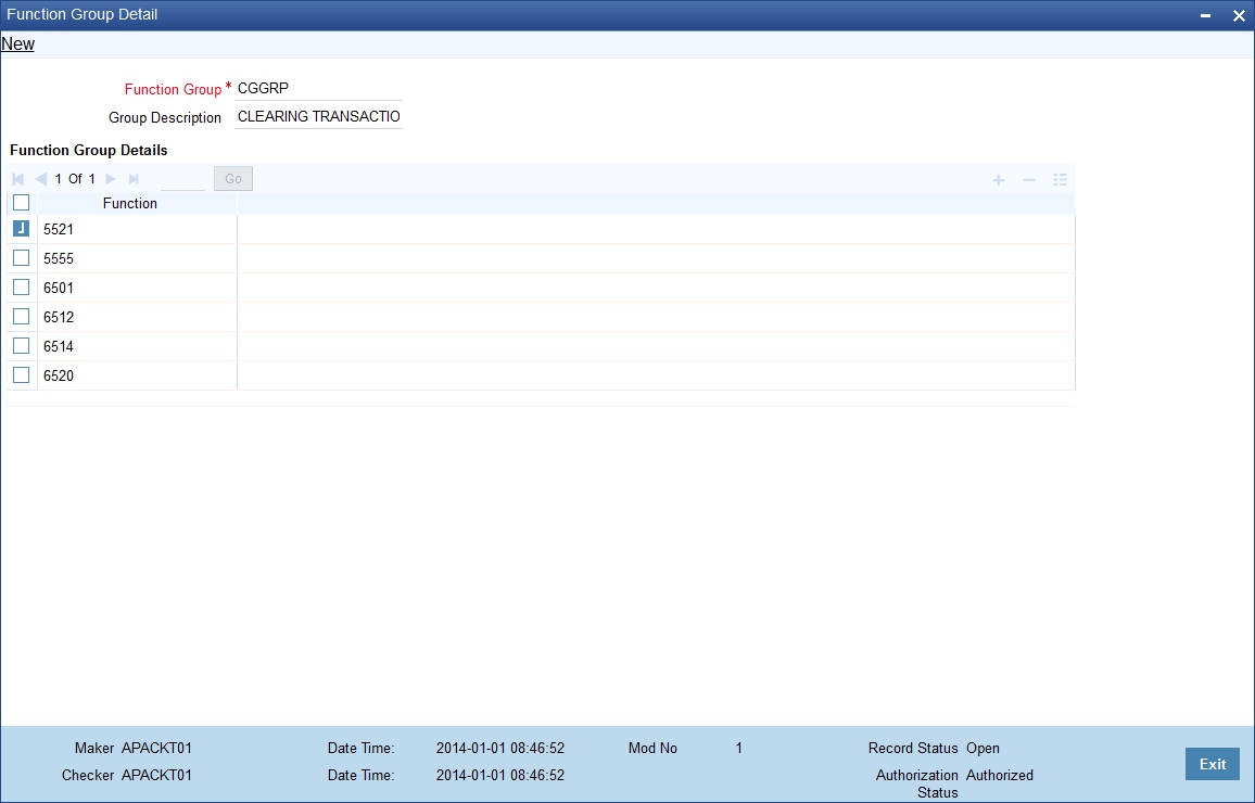 You can logically club the function IDs to a function group using the ‘Function Group Detail’ screen. To invoke this screen, type ‘STDFNGRP’ in the field at the top right corner of the Application tool bar and clicking the adjoining arrow button.