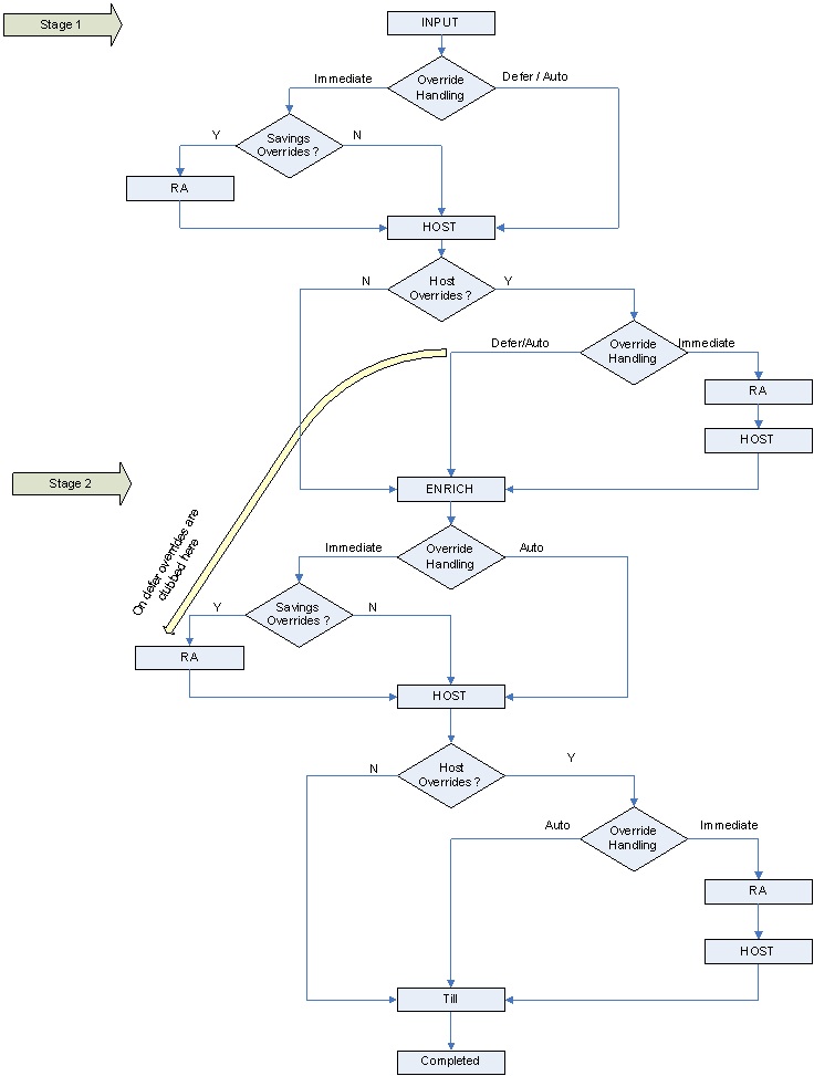 The system performs certain validation during enrich stage. During validation, if system raises an override as Immediate, then the transaction is moved to Savings Overrides for authorization. On successful Remote Authorization if required, the transaction will proceed with Work Flow i.e. to HOST. If Remote Authorization is not required the transaction directly hits HOST.