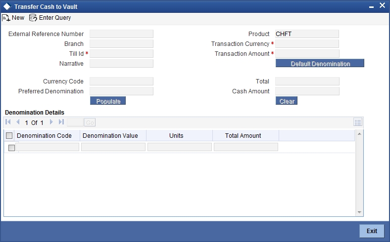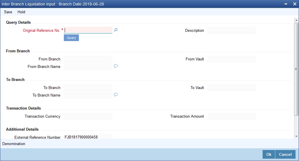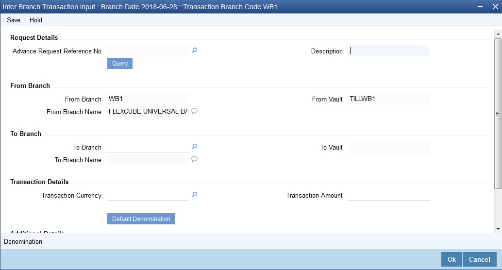 You can transfer cash from source branch to destination branch in the ‘Interbranch Transaction Input’ screen. You can enter vault details to which the cash will be received in this screen.