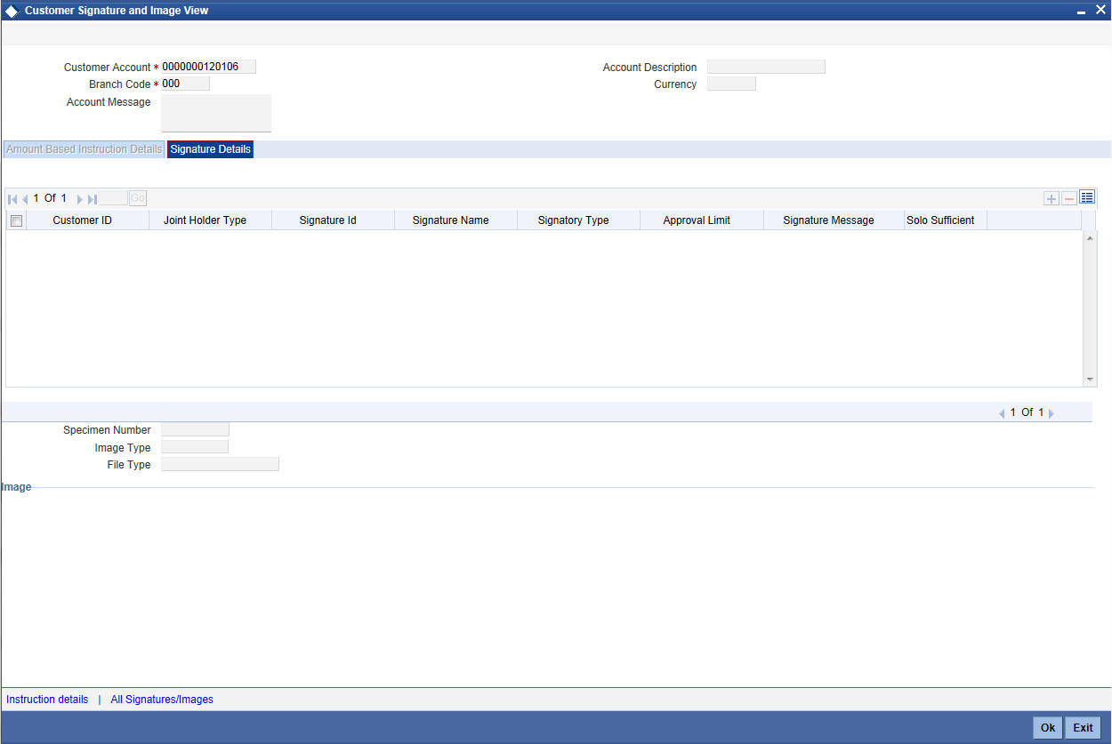 Specify the customer number to verify the signatory details. Alternatively, you can select the customer number from the option list. The list displays the customer number maintained in the system.