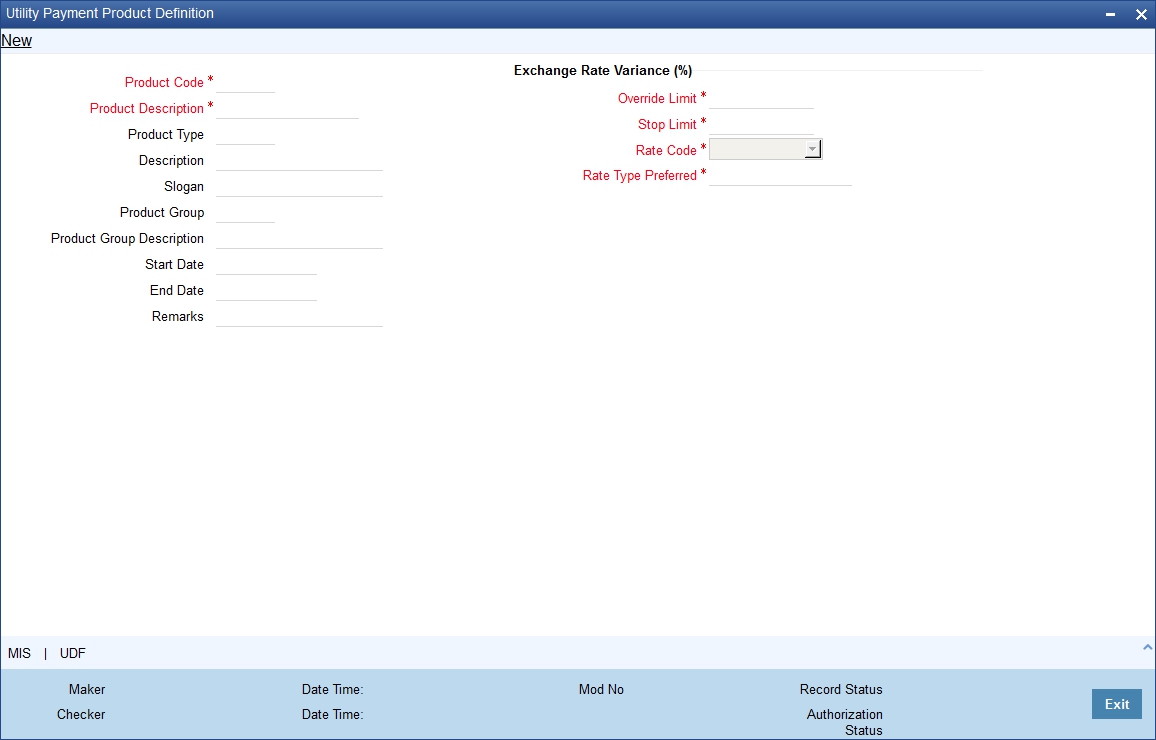 Click ‘MIS’ to specify any MIS details that would be applicable for any utility payment transactions involving the product.