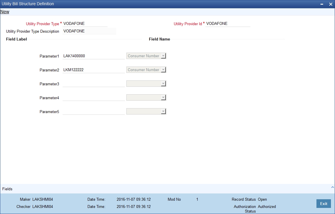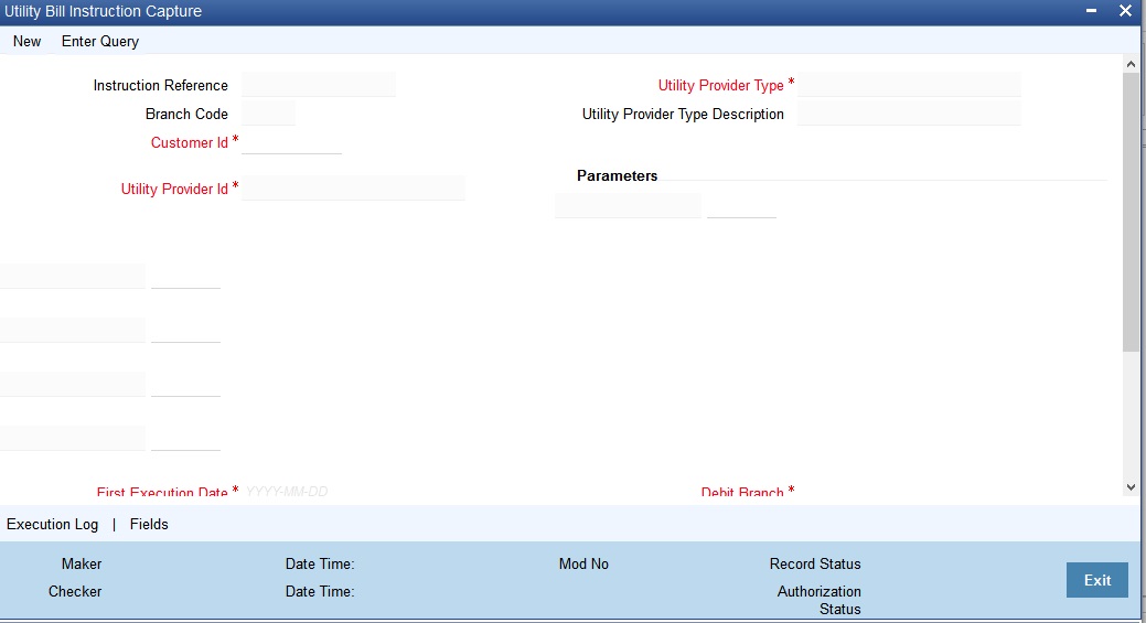 The system picks up all parameters maintained for the utility provider type and displays them here. You can specify values for each one of them.