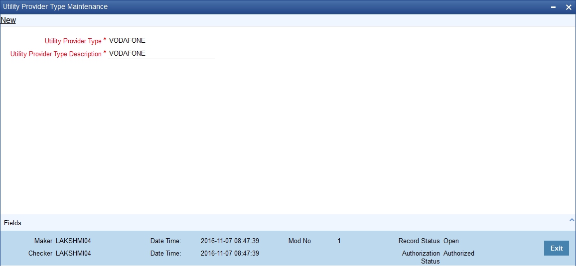 You can maintain different types of utility providers using the ‘Utility Provider Type Maintenance’ screen.