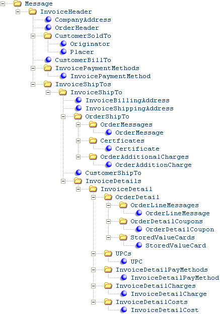 • If you exclude the element InvoiceHeader and all of its children (using the Invoice Outbound XML Inclusion rules), the system sends an invoice download message including only the Message element and its attributes: