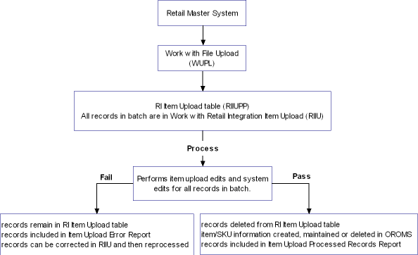 How do you process records in the RI Item Upload table? Once you have passed item upload records from your retail master system to the RI Item Upload table, you can view all the records in the batch using the Working with Retail Integration Item Upload (RIIU) menu option. In order to process the records in the RI Item Upload table:
