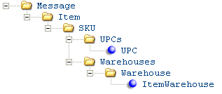 This element includes information on the warehouse itself, and is provided in the message only if there is an Item Warehouse record for the item/SKU. See Inventory Download Process for more information. See Creating and Maintaining Warehouses (WWHS), especially the Create Warehouse Screen, for more information on the information provided in the Warehouse element. |