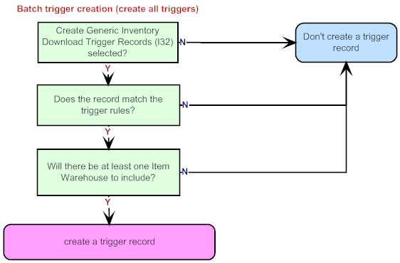 Creating triggers interactively enables the INV_DOWNLD job to process them throughout the day and keep an external system up to date. If the Create Generic Inventory Download Triggers (I32) system control value is selected, the system creates inventory download triggers interactively: