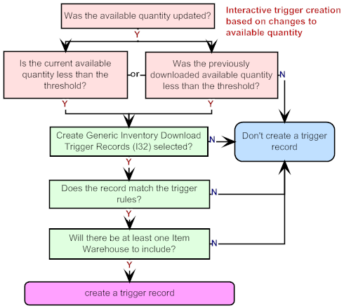 The criteria the system uses to generate triggers based on changes to availability are described below. See Creating Inventory Download Triggers through Purchase Order Creation or Maintenance for more information on when the system generates trigger records due to purchase order activity.