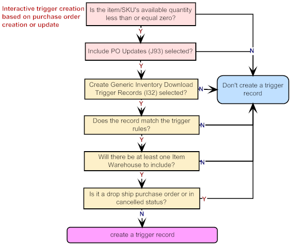 If the Create Generic Inventory Download Triggers (I32) and the Include PO Updates (J93) system control values are selected, the system creates an inventory download trigger record whenever you create or maintain a purchase order if: