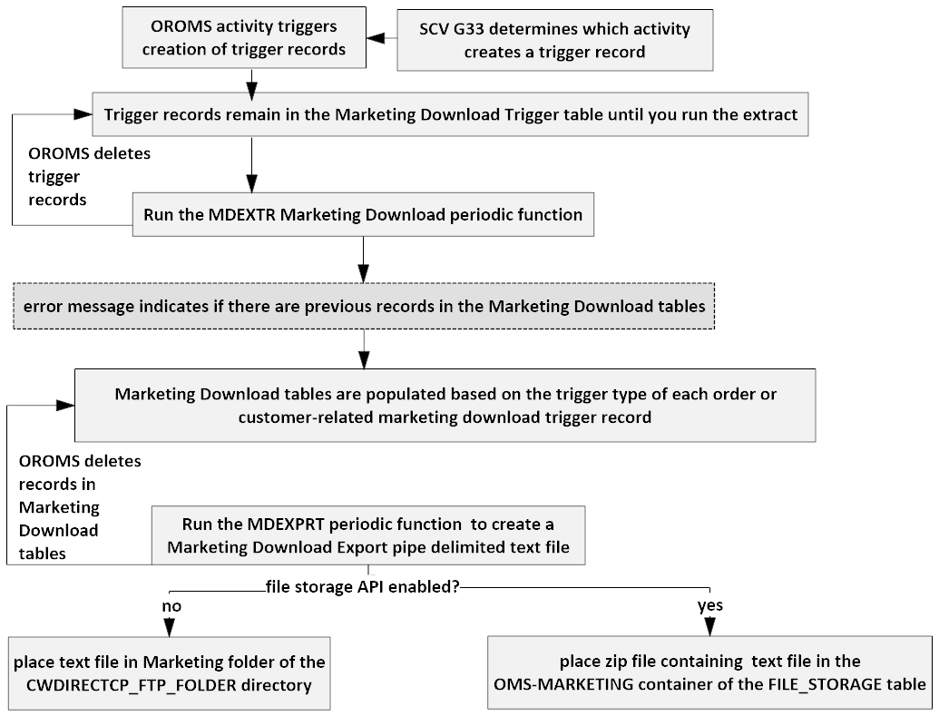 • Run the MDEXTR Marketing Download Order and Customer Extract (CSX1041) periodic function to extract order and customer-related records in the Marketing Download Trigger table to the appropriate Marketing Download table.