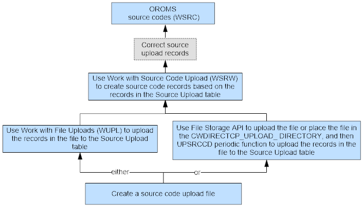 Once you upload records to the Source Upload table, you can use the Work with Source Code Upload File (WSRW) menu option to change, delete, or display source upload records and then transfer the records to the Source Code table.