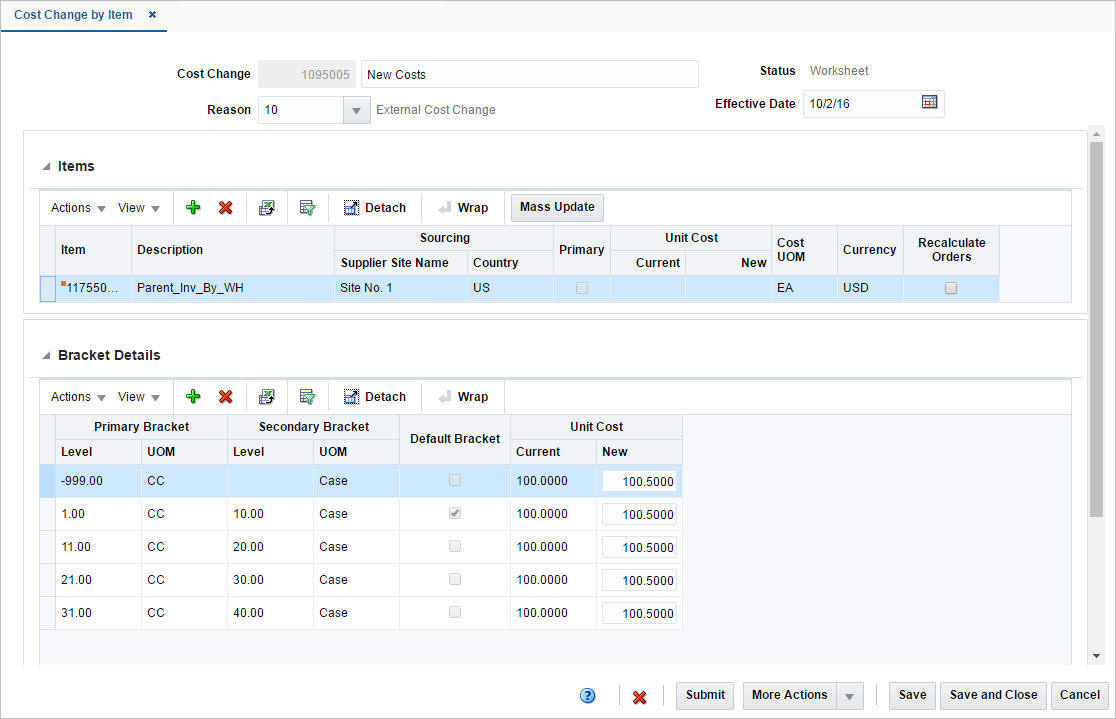 For items with brackets defined, the old unit cost and the new unit cost information is shown in the Bracket Details section and not in the Items section.