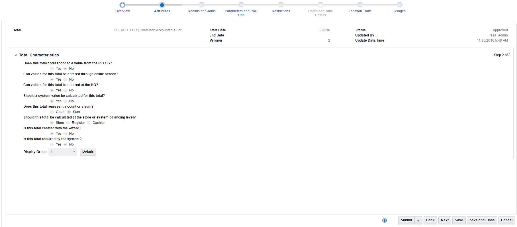 Required by the system | Determines whether the total is system required. The only totals that are required by the system and must be set up before production usage are:OVRSHT_S – Used for the store level over/short total.OVRSHT_B – Used for the balancing level over/short total (this is only used if the SA_SYSTEM_OPTIONS. BALANCE_LEVEL_IND is either ’C' – cashier or ’R' – register. |