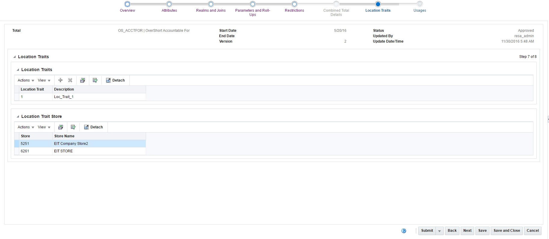 The Location Traits window allows you to associate total definitions with stores. The totals are calculated for each store that has the location trait. If multiple traits are added and have overlapping stores, the total is calculated once per store. Location Traits are defined in RMS. It is recommended that when ReSA is used, you create an All Stores location trait and associate that trait with all available stores. While some regional or loss prevention totals can be associated with limited groups of stores, you must associate other totals (such as, Over/Short) with every store that uploads data to ReSA.
