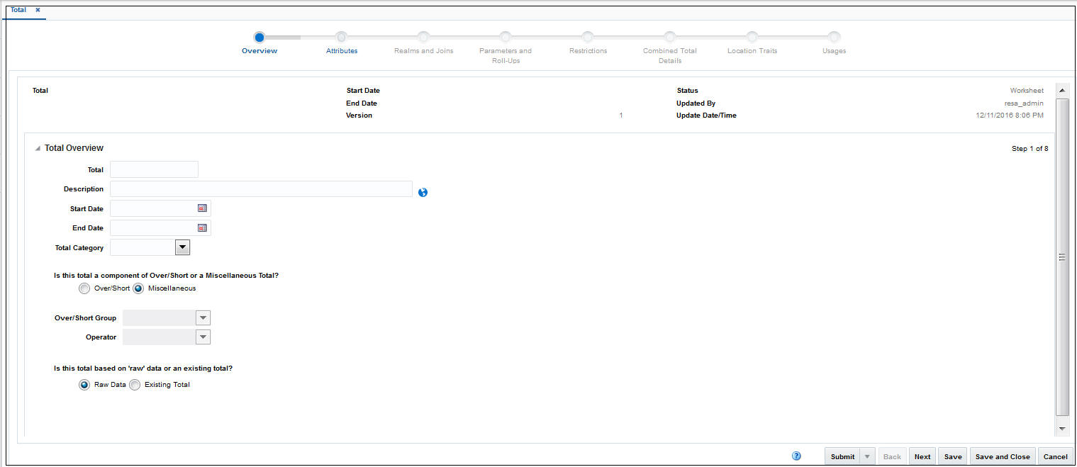 The Total Maintenance wizard allows you to create and update a total definition. It involves a series of steps where various details such as, total type, total entity, data source, roll up level, total usage can be specified. Each window in the wizard has a text box to the right that displays help text for each field. You should understand the following concepts before you create or update a total: